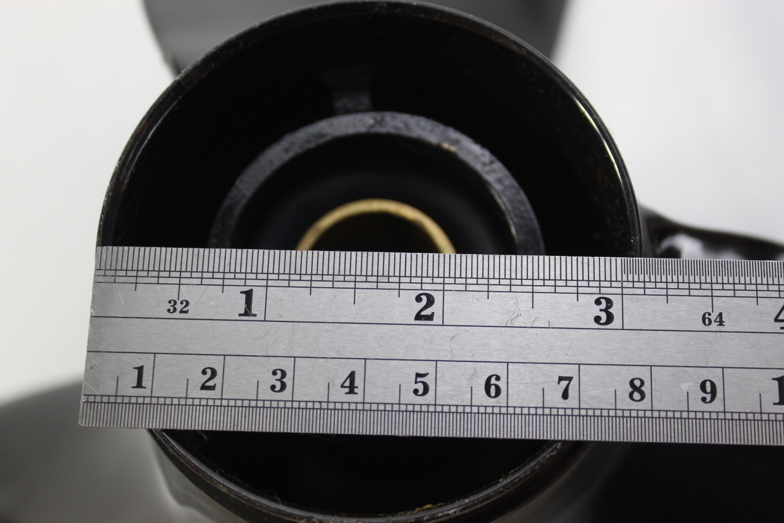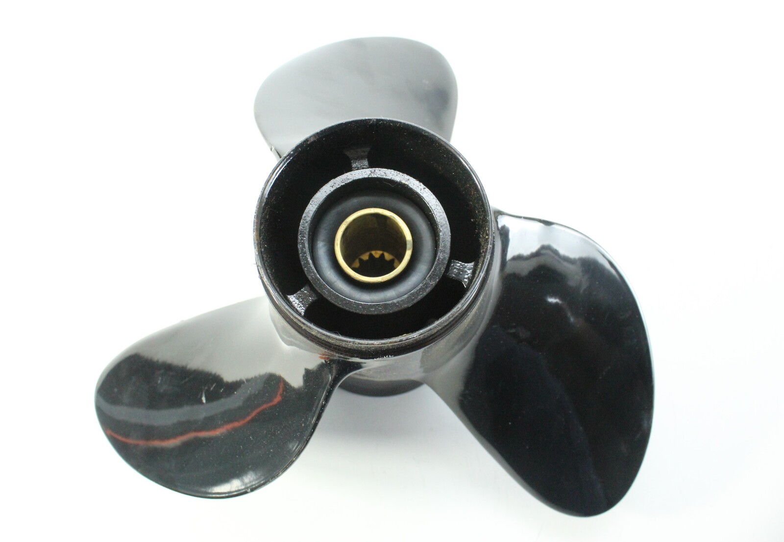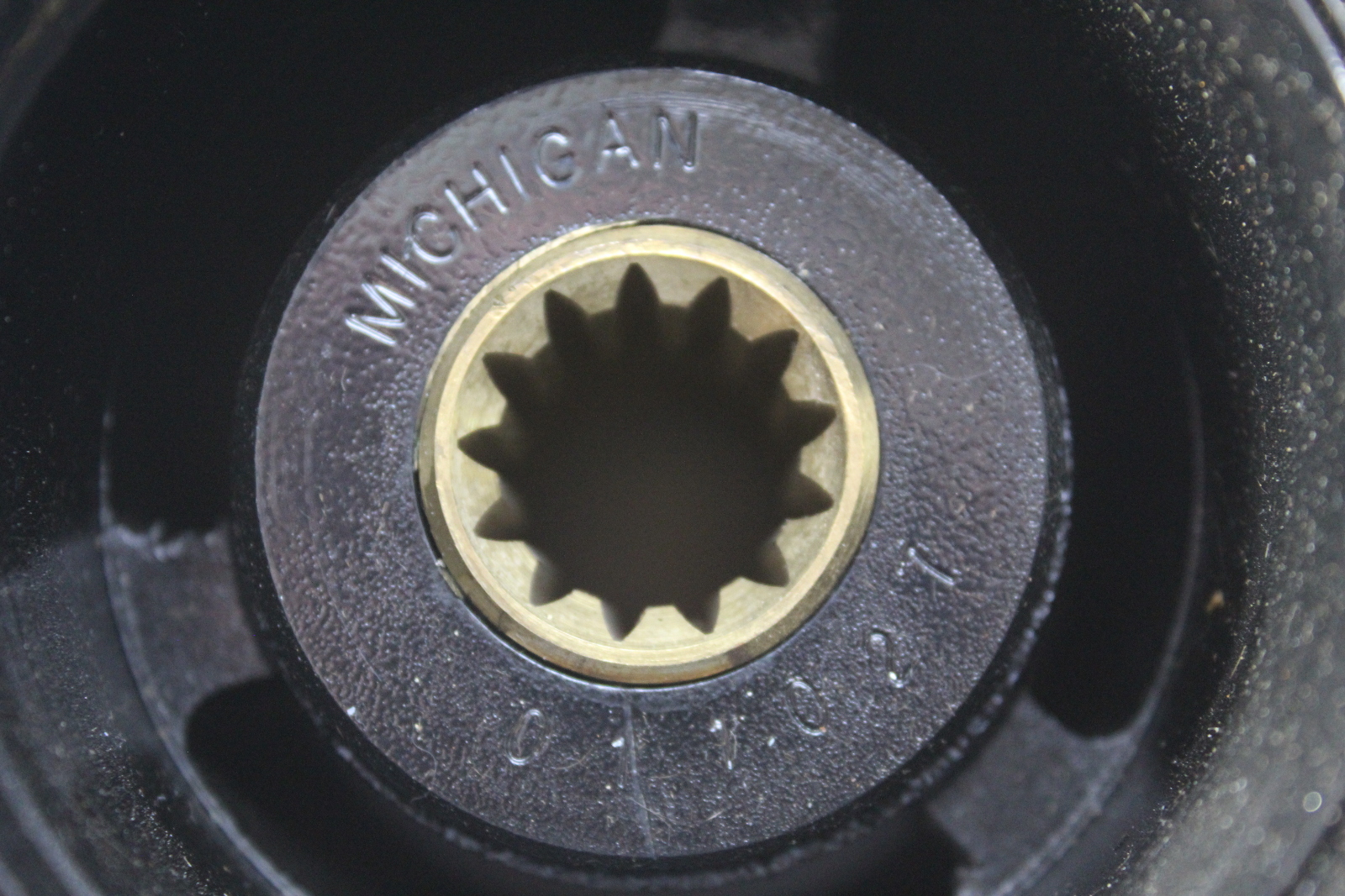 Michigan Wheel Michigan Match 12-1/4 x 15 aluminum propeller with Johnson / Evinrude style rubber bushing hub installed. New old stock — never installed, never run. Paint damage from storage and transport — blades undamaged. Replaces Johnson / Evinrude OEM 176421.