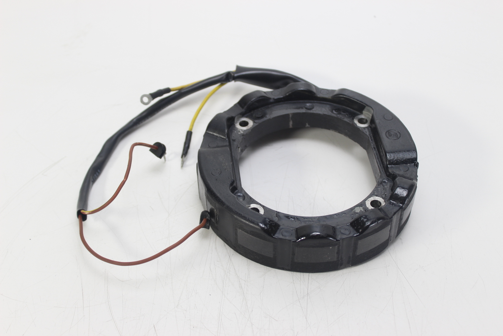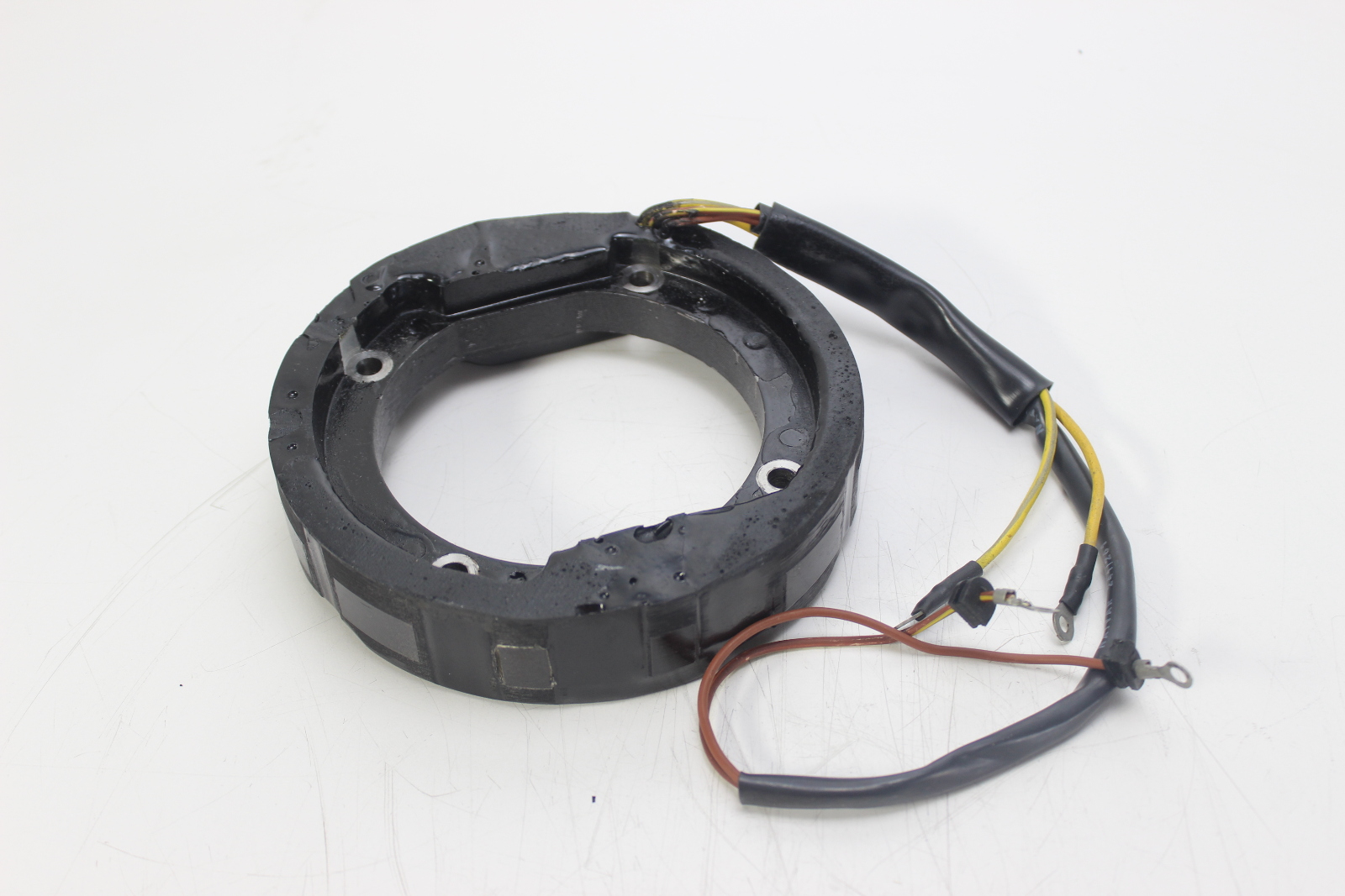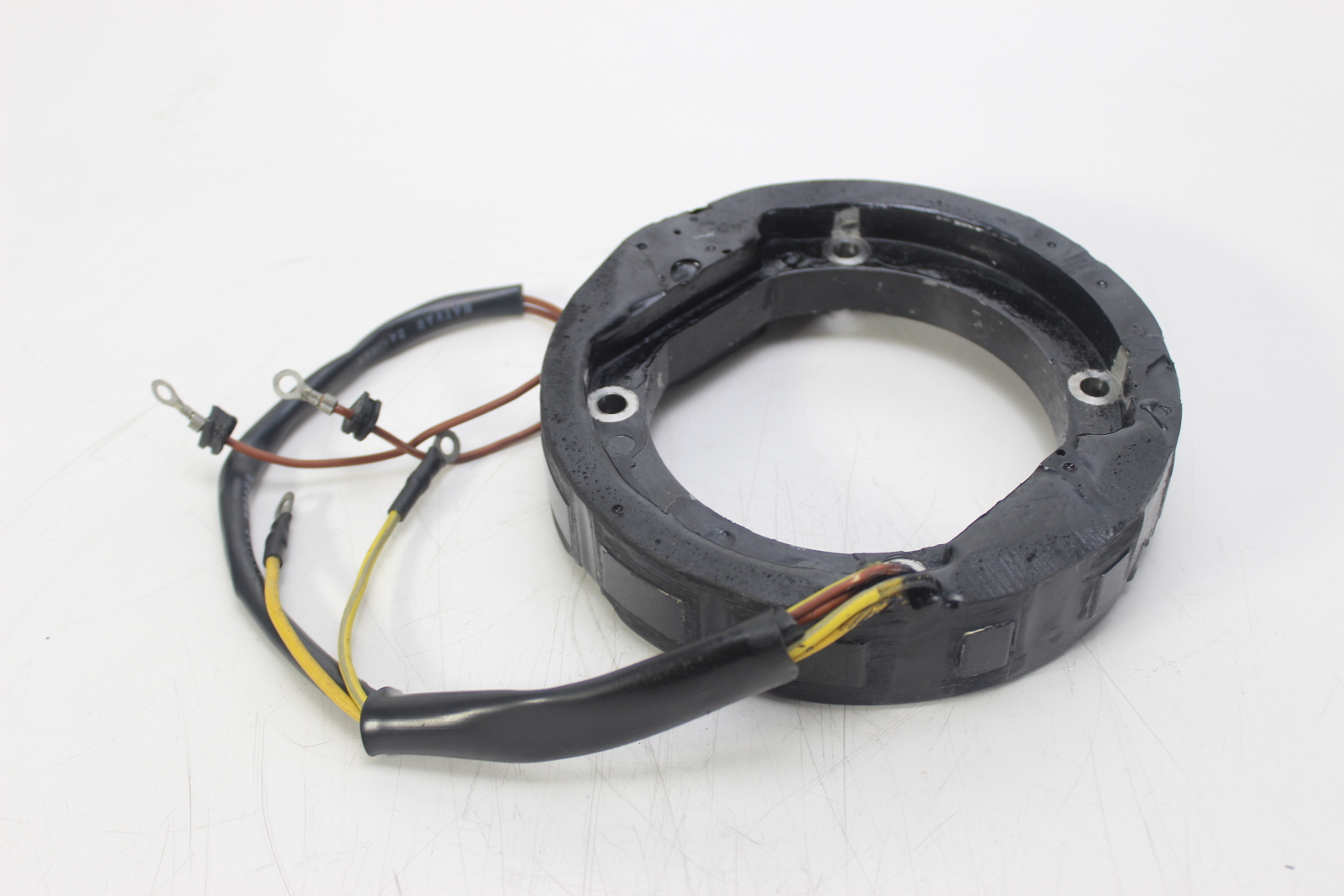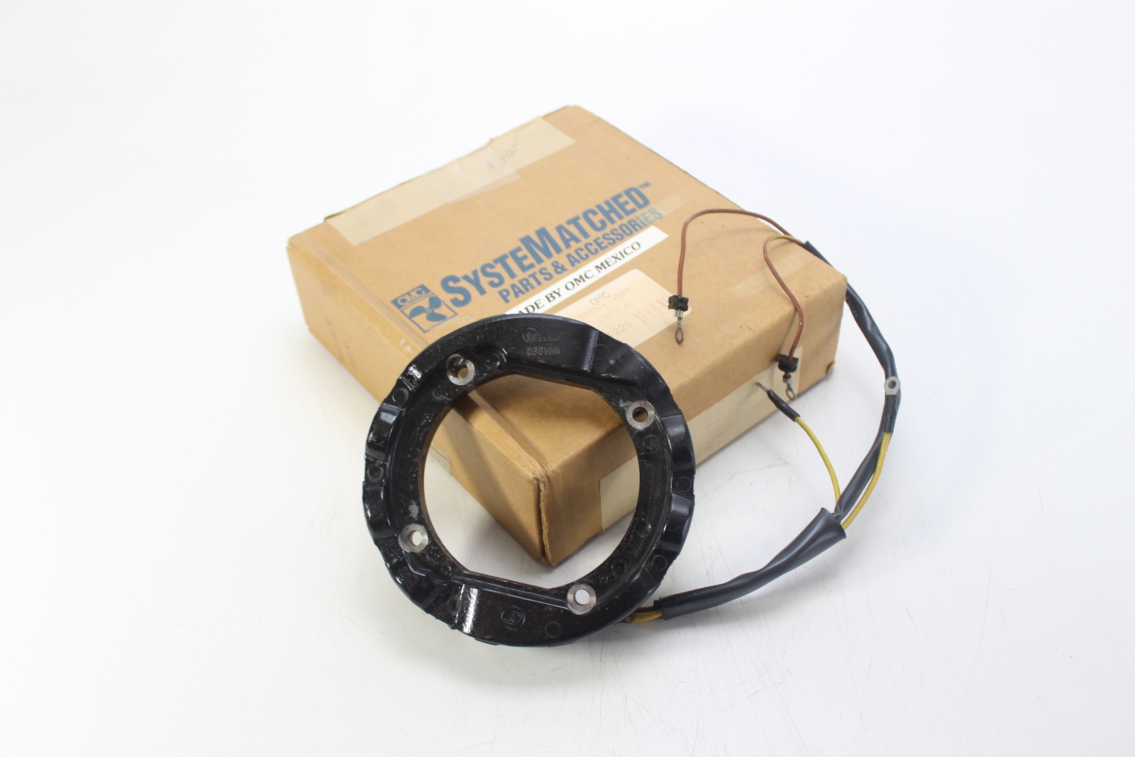 New OEM OMC stator for Johnson and Evinrude 4-cylinder 2-stroke outboard motors. 6-amp charging system, screw terminal power pack. New old stock.