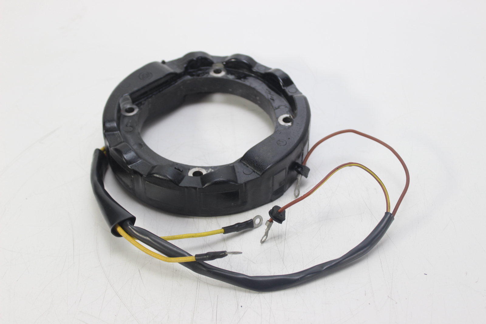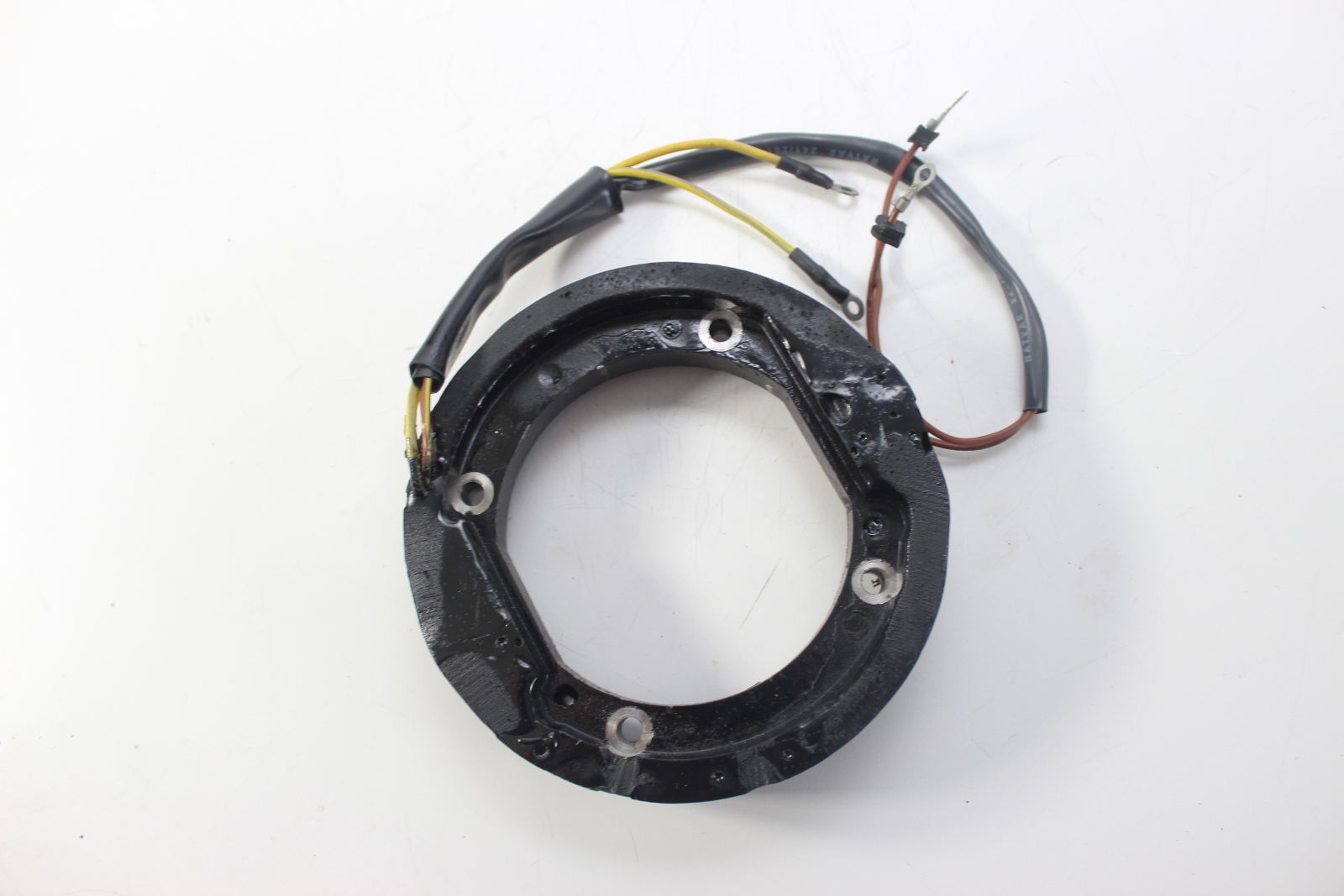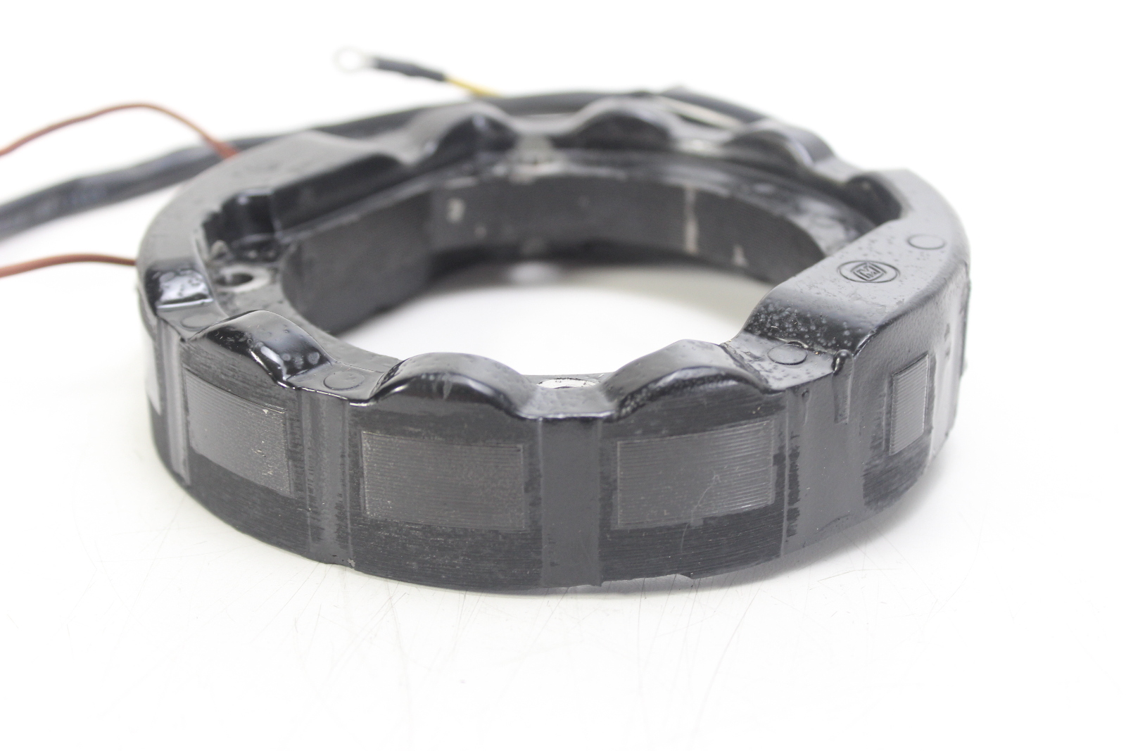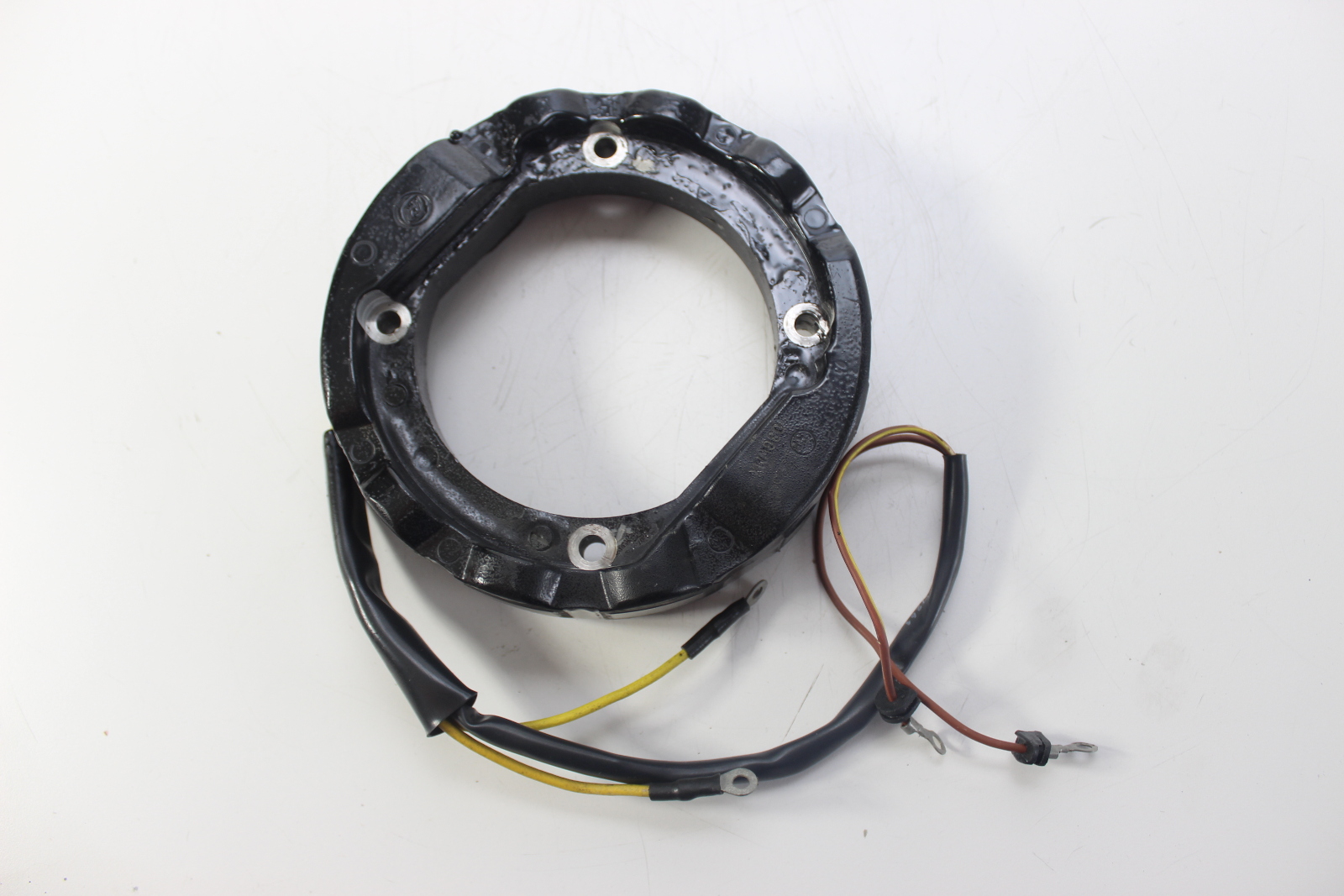New OEM OMC stator for Johnson and Evinrude 4-cylinder 2-stroke outboard motors. 6-amp charging system, screw terminal power pack. New old stock.