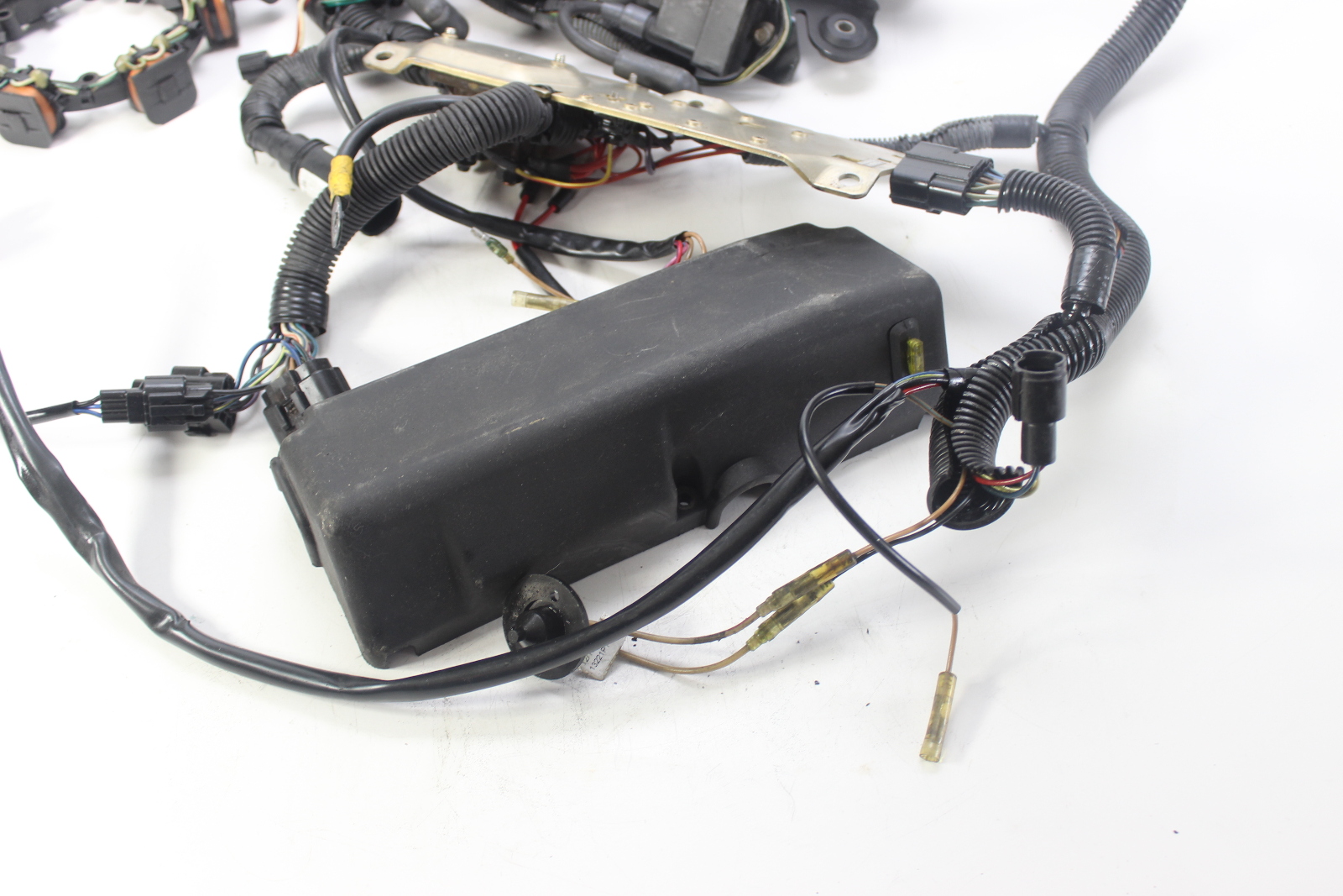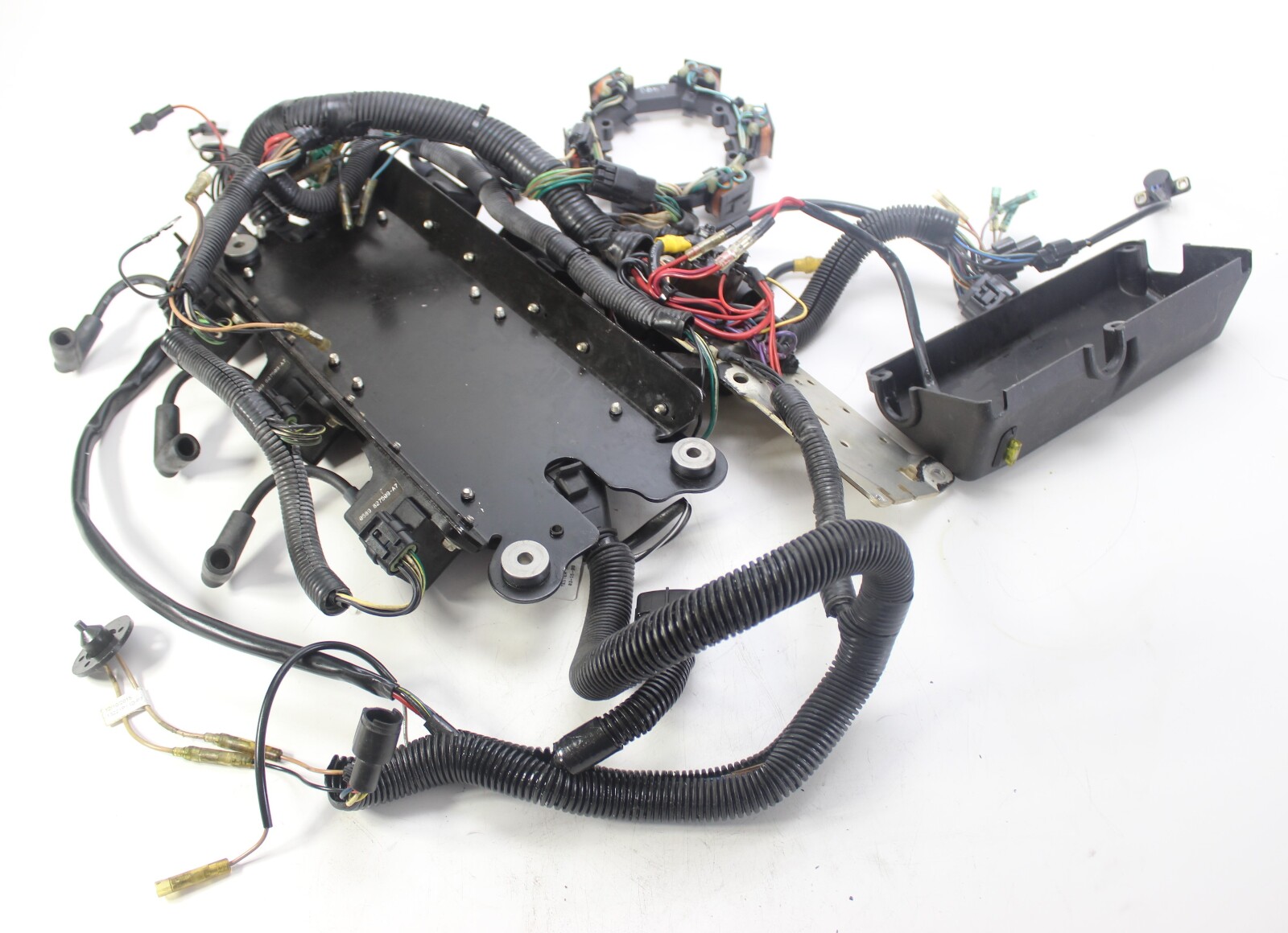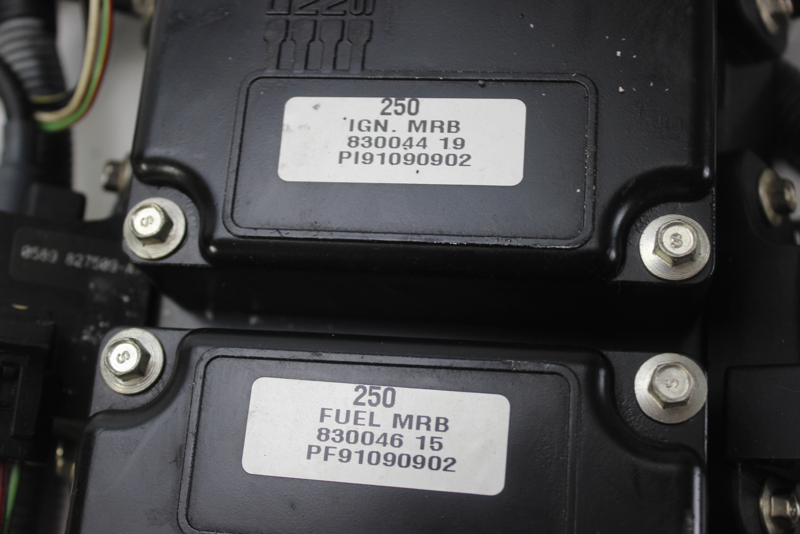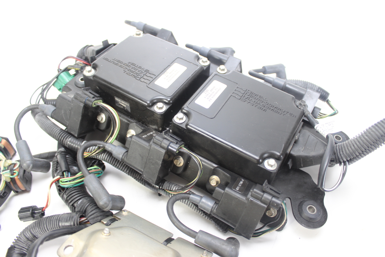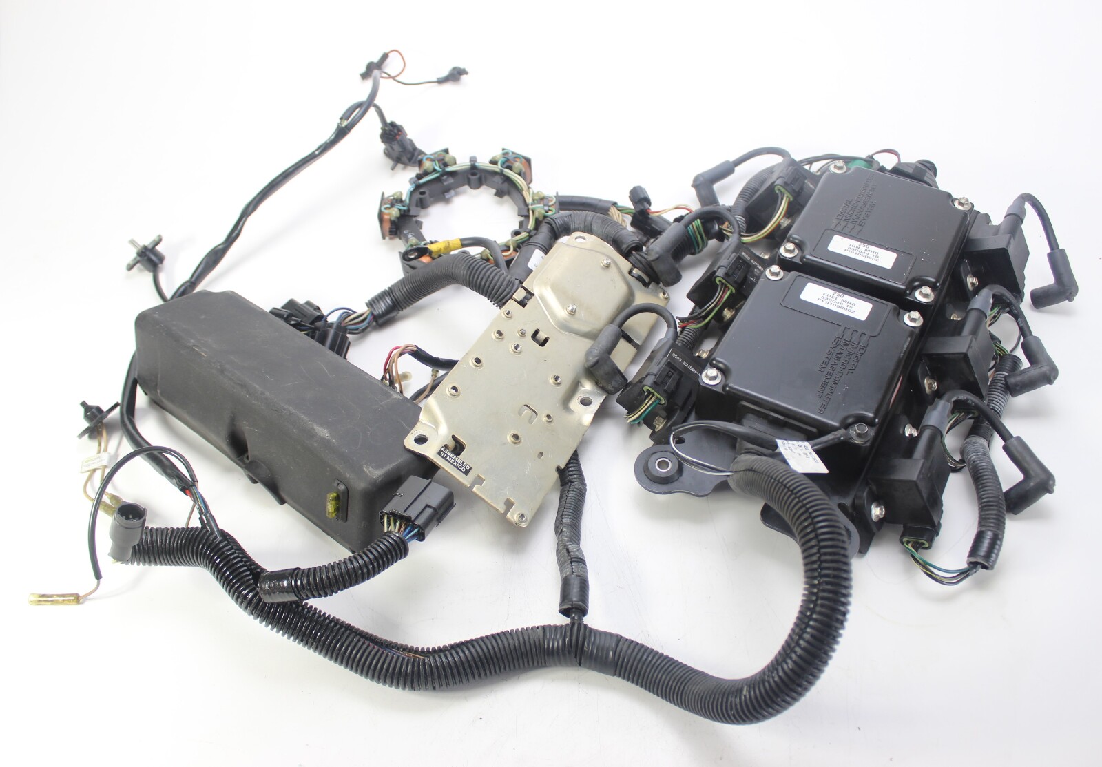 Complete Mercury 3.0L EFI ignition and fuel control system removed from a 1998 Mercury 250 HP 3.0L EFI outboard.
