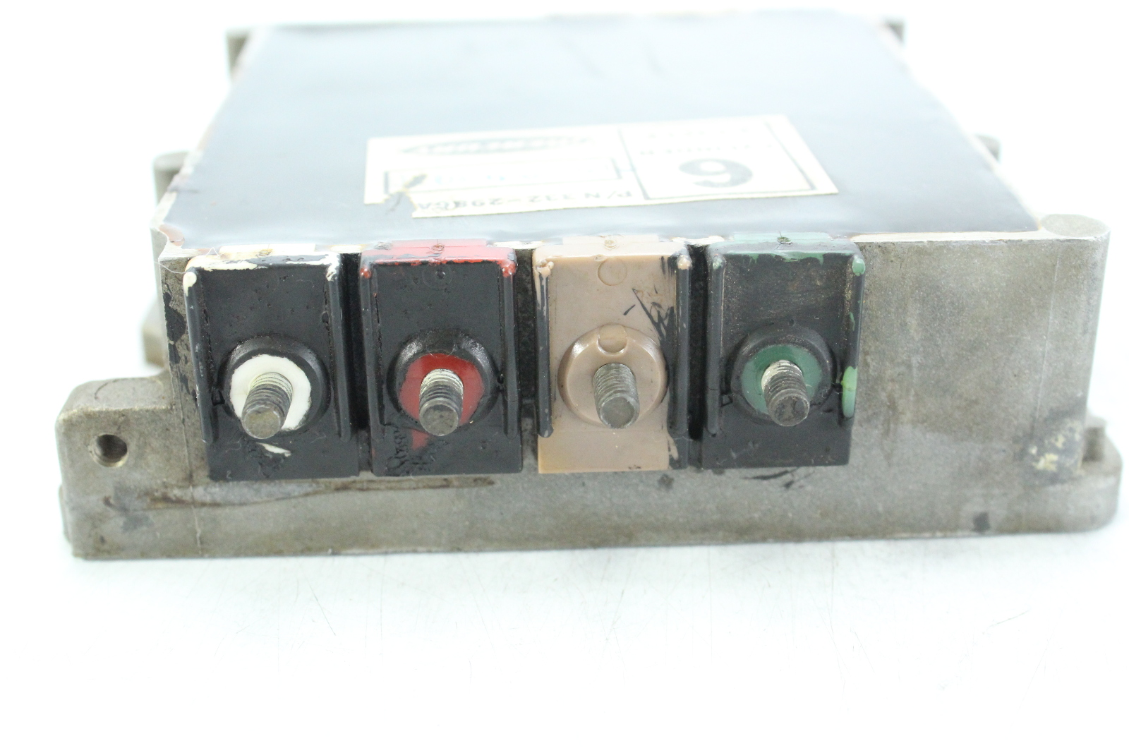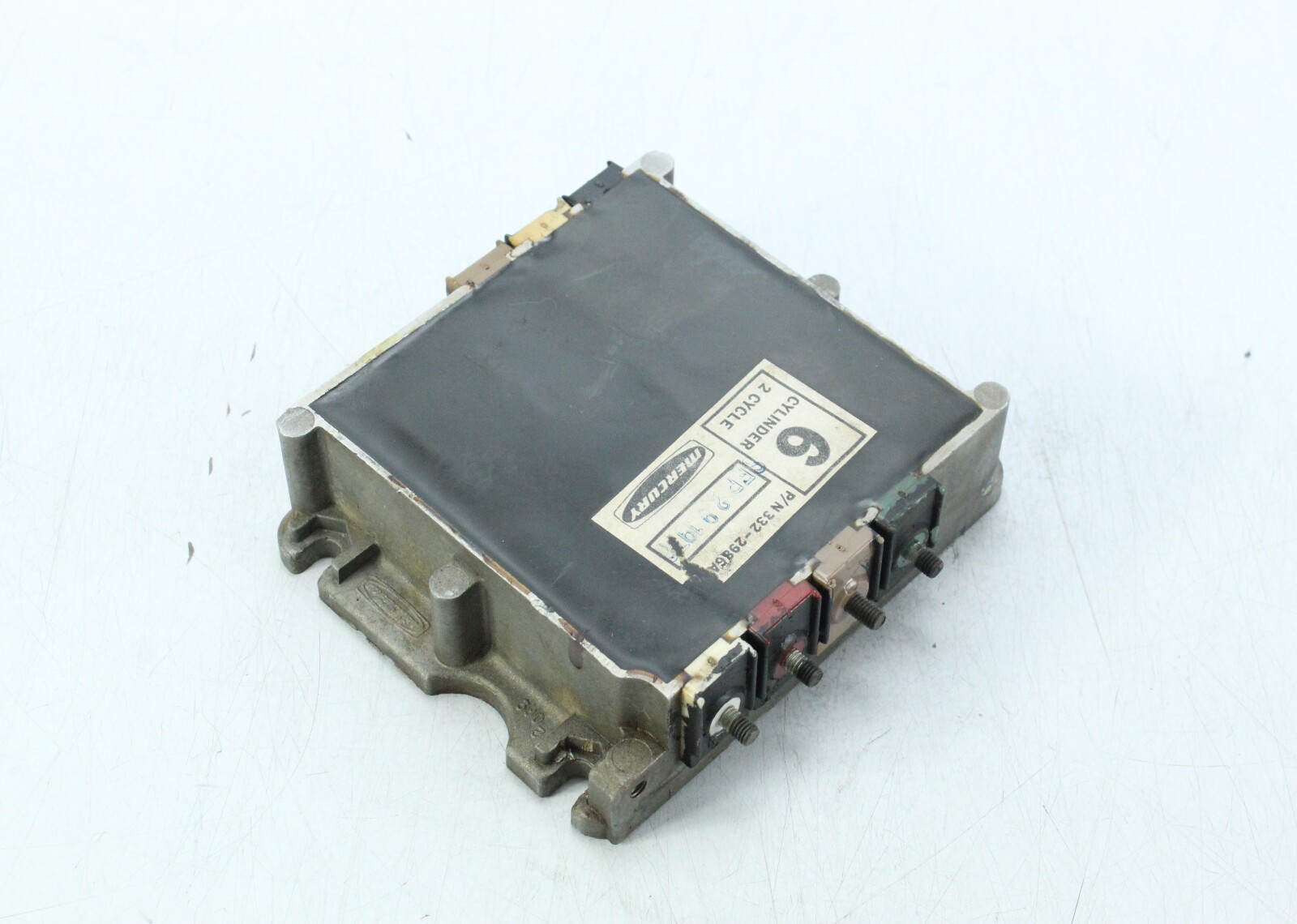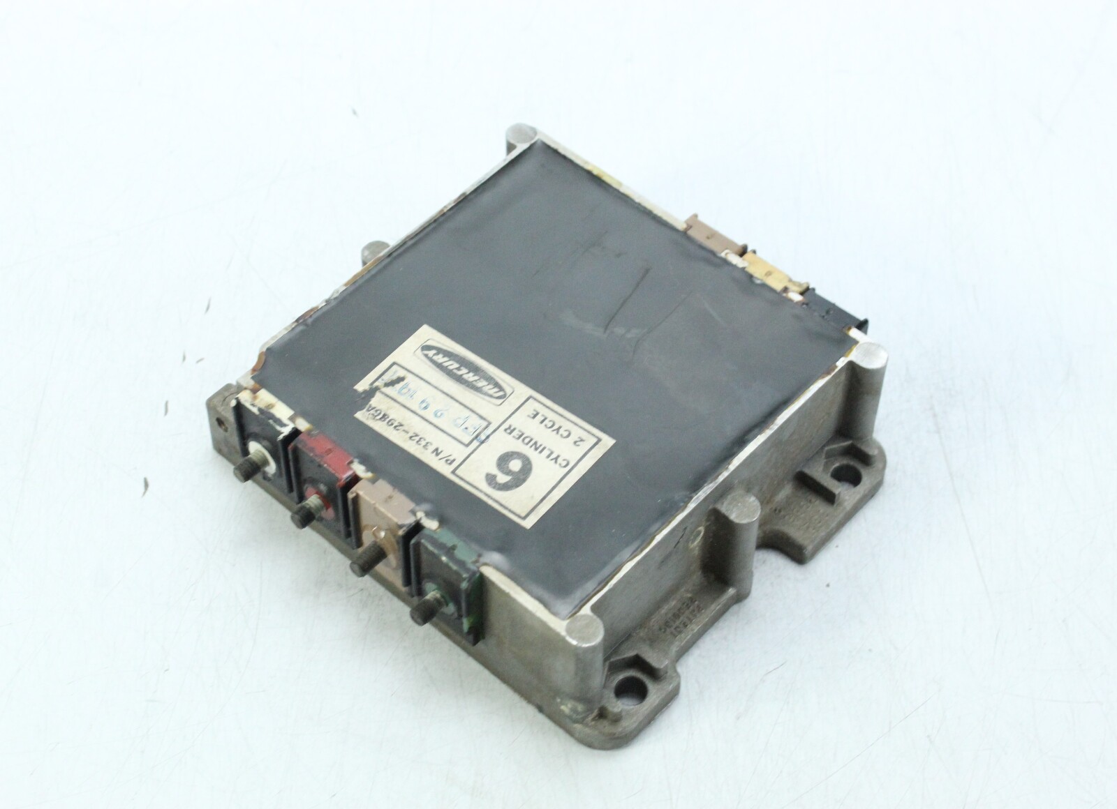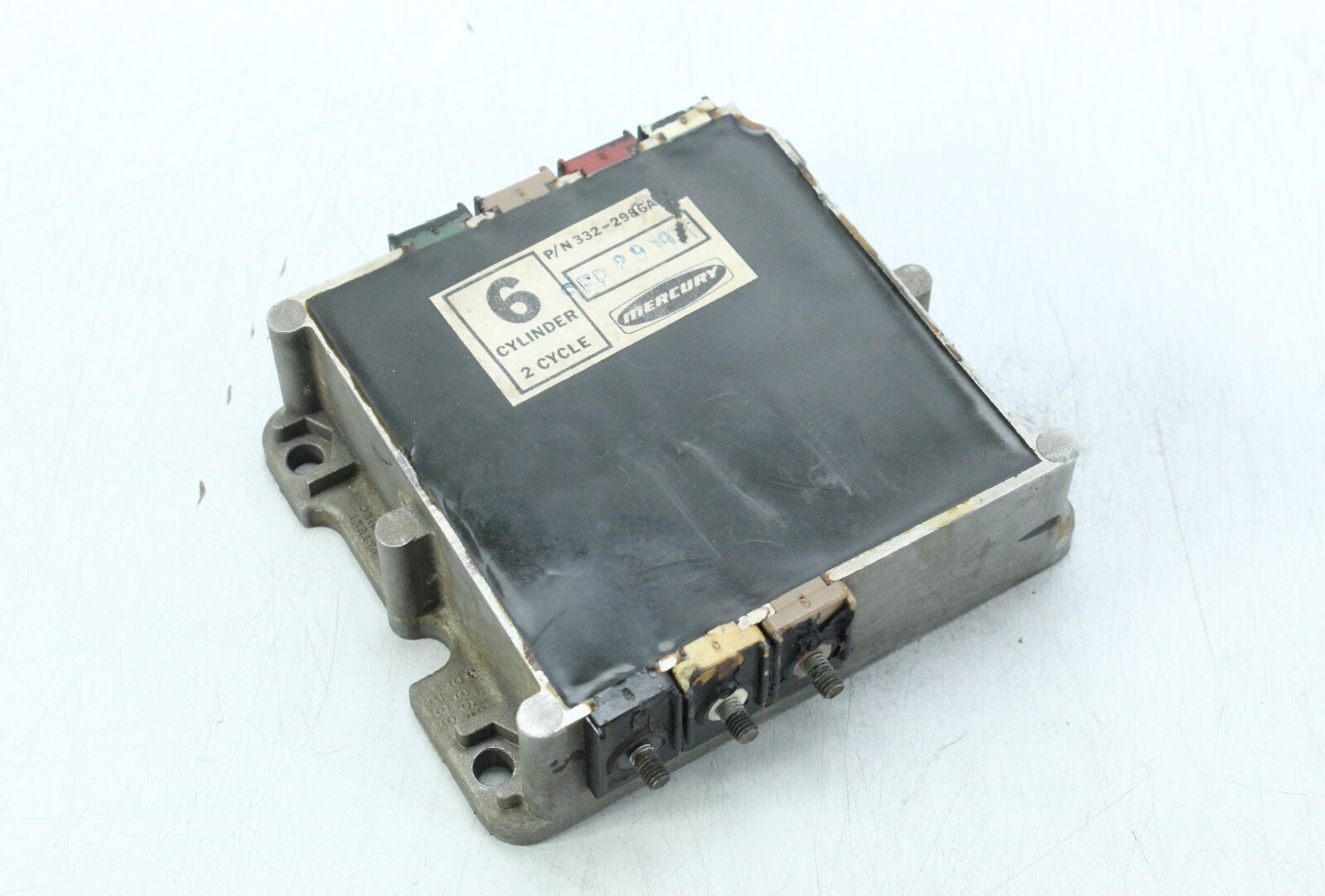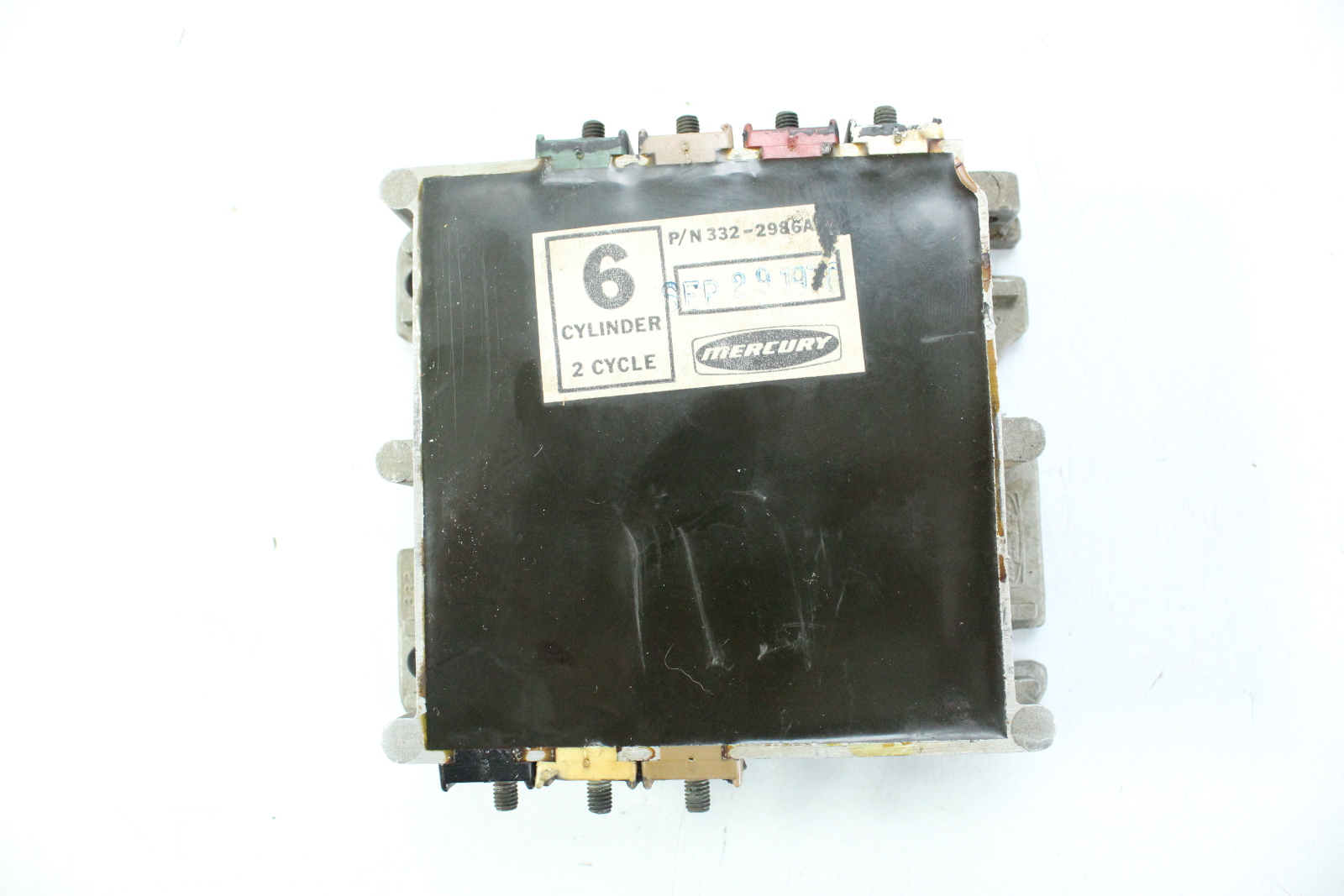OEM Mercury switch box used on inline 6 cylinder Mercury outboards from the 1970s. This ignition module is responsible for controlling spark timing and distributing ignition signals to the engine’s ignition system.