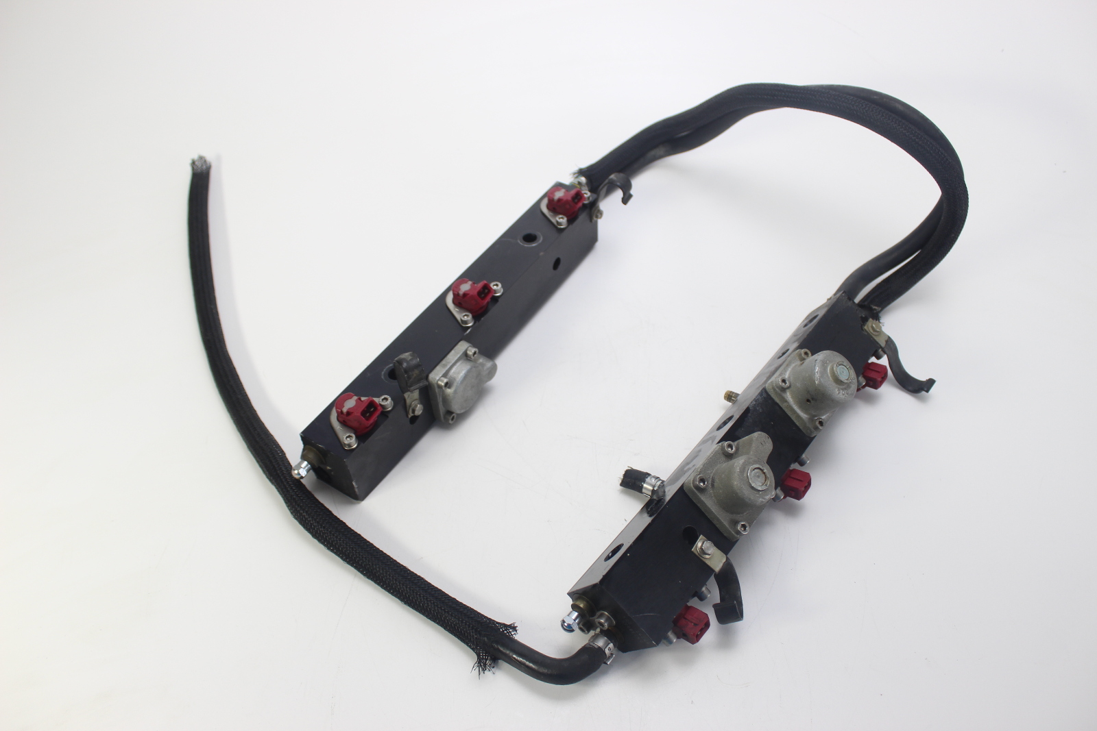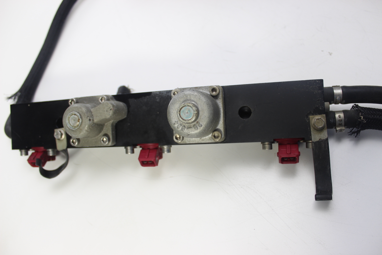 OEM Mercury Optimax fuel rail assembly with injectors for 3.0L V6 DFI outboards.