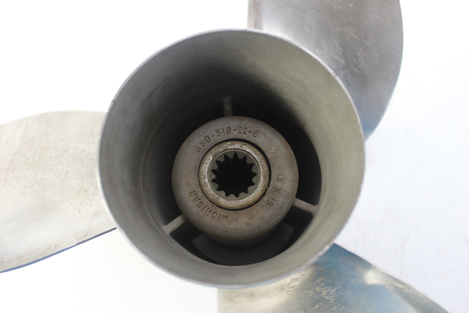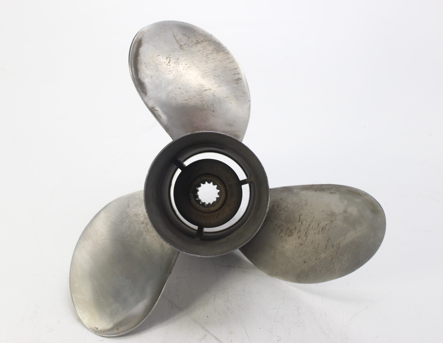 Michigan Wheel stainless steel propeller. Michigan Wheel is a well-established American propeller manufacturer producing OEM and aftermarket props for a wide range of outboard and sterndrive applications. This is a 3-blade stainless prop built for thru-hub exhaust with standard right-hand rotation. A solid performer for the motors listed below.