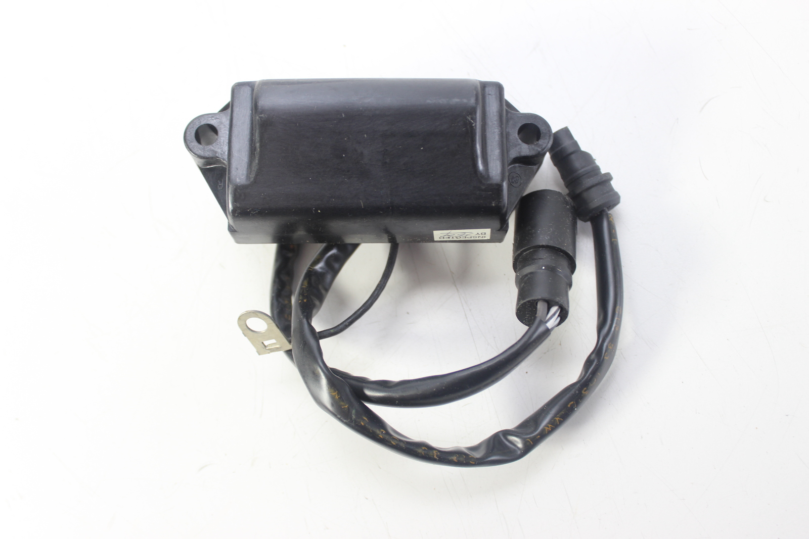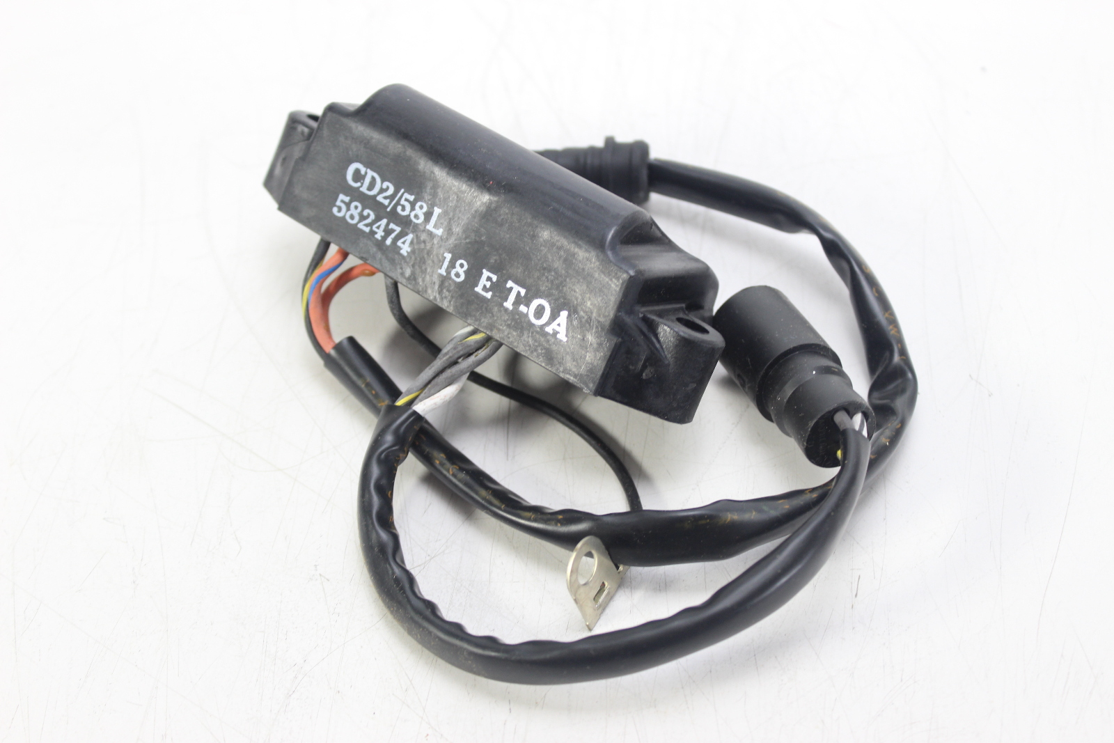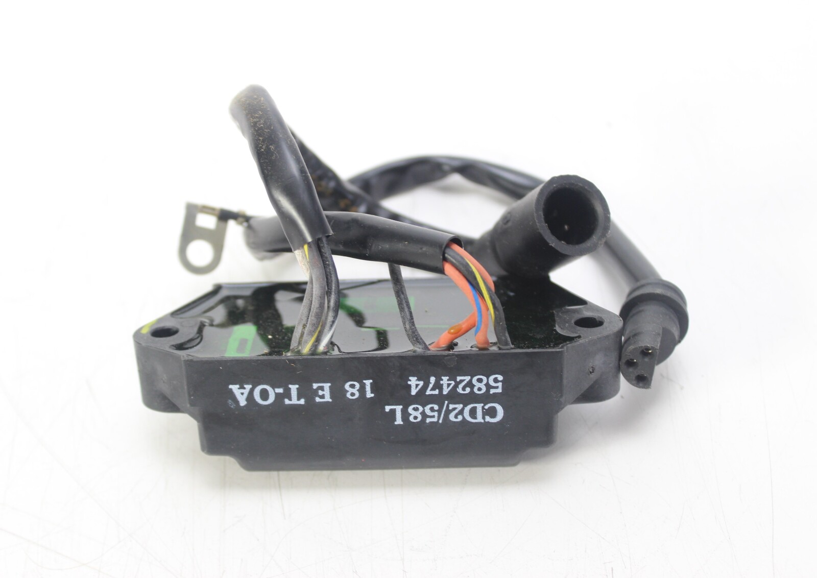 New old stock OEM Johnson Evinrude CD2 power pack for 2-cylinder commercial outboards. Controls spark timing via a 2-wire trigger and includes a 5800 RPM limiter. Works with the stator and trigger to fire the ignition coils.